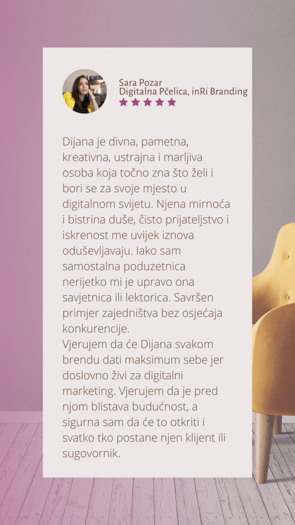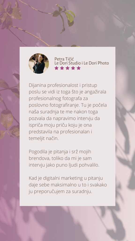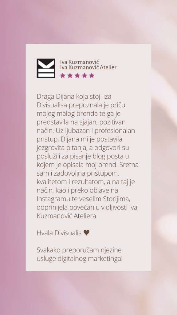 Ja sam Dijana, a moj cilj je kroz jednostavan, aktualan i kvalitetan sadržaj pomoći proizvodnim biznisima u snalaženju u online svijetu i povećanju svijesti o njihovom brendu kroz brojne usluge u Divisualis ponudi.