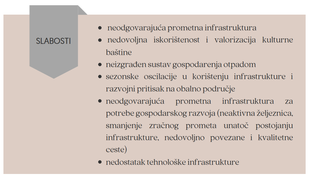 Sadašnje stanje u turizmu županije pokazuje brojne slabosti poput neodgovarajuće prometne infrastrukture te nedovoljne valorizacije kulturne baštine, neizgrađenog sustava gospodarenja otpadom, nedostatka tehnološke infrastrukture, sezonske oscilacije u korištenju infrastrukture i razvojnog pritiska na obalno područje te neodgovarajuće prometne infrastrukture za potrebe gospodarskog razvoja.
