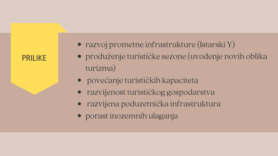 U županiji su prisutne i brojne prilike. U Istarskoj županiji to su razvoj prometne infrastrukture, produženje turističke sezone uvođenjem novih oblika turizma, povećanje turističkih kapaciteta, razvijenost turističkog gospodarstva, porast inozemnih ulaganja te razvijena poduzetnička infrastruktura.
