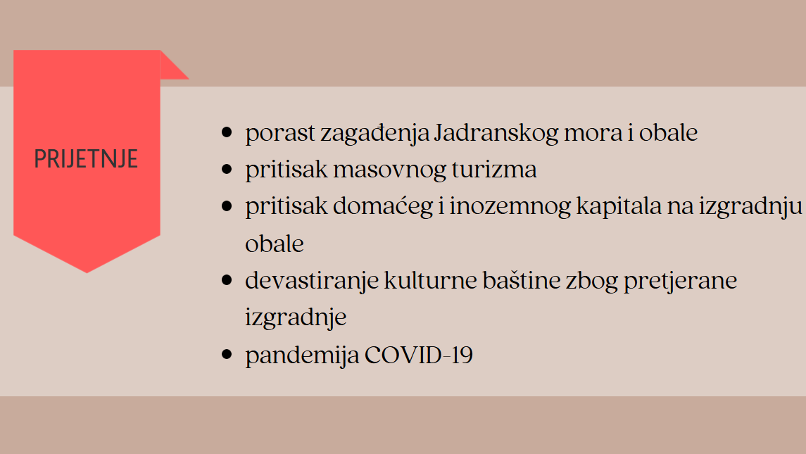 Također, u županiji su prisutne i brojne prijetnje. Prijetnje s kojima se Istarska županija susreće su porast zagađenja Jadranskog mora, pritisak masovnog turizma, pritisak domaćeg i inozemnog kapitala na izgradnju obale, devastiranje kulturne baštine zbog pretjerane izgradnje te pandemija COVID-19.